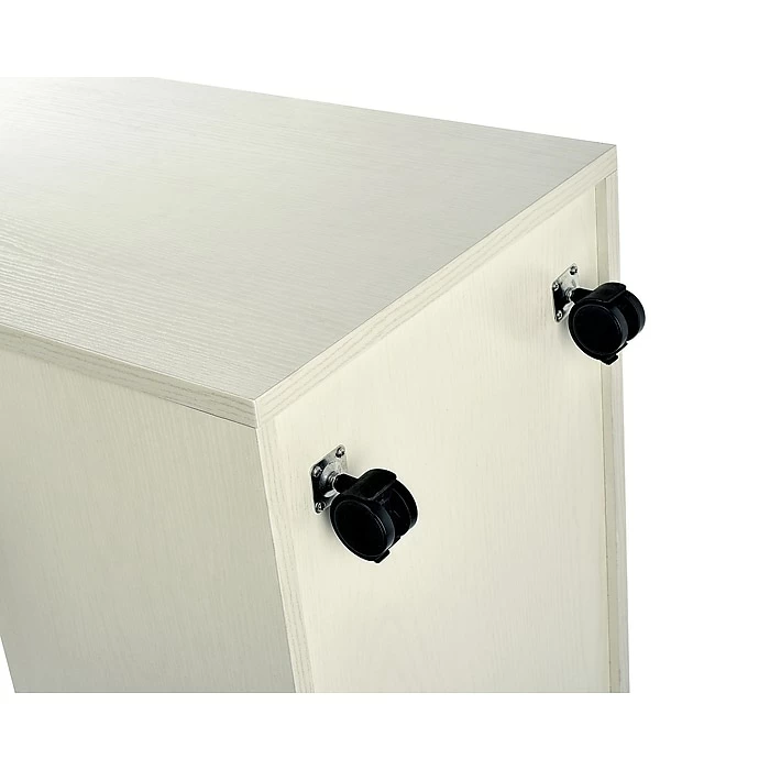 - Made of particleboard and comes in a lovely white vinyl laminate finish