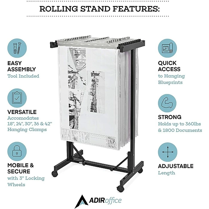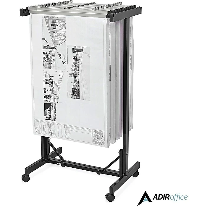 The Adir Expandable Mobile Plan Center 615 is perfect for hanging blueprint storage of your largest files. Just clip your large documents, such as blueprints, plan drawings, and maps, into a hanging file clamp, and place the clamp into the bracket. This mobile blueprint rack has an 18 clamp capacity, and can be adjusted to fit hanging clamps 24, 30, 36, or 42 inches long. (Only one size clamp will fit into this mobile plan rack at a time). Hanging paper clamps are sold separately.