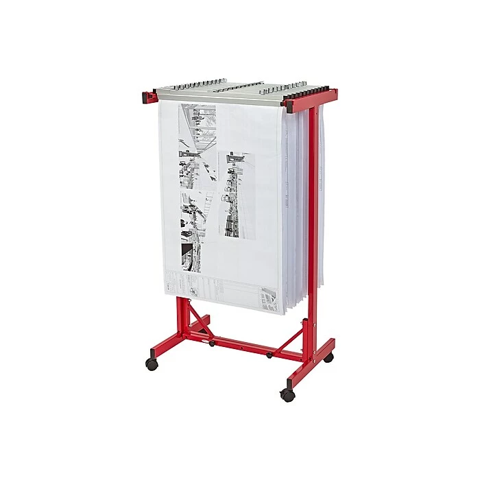 Carrying documents from desk to desk or shuffling them about is messy and passé. This mobile plan center lets you easily roll your files anywhere, anytime. Simply drop the files in and lift them out, as needed. Composed of heavy-gauge steel with ball bearing swivel casters (two with brakes), this unit allows for up to 18 hanging clamps with adjustable widths of 24″, 30″, 36″, and 42″. Clamps are sold separately. The stand is simple to set up and use.