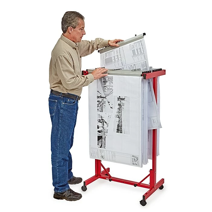 - CONVENIENT DESIGN. Accommodating up to 18 clamps at the same time, just clamp your files into the paper clamps and drop them into the top bracket for quick access to your hanging blueprints. Please note: Only one size of hanging clamps can be placed into this mobile blueprint stand at a time.