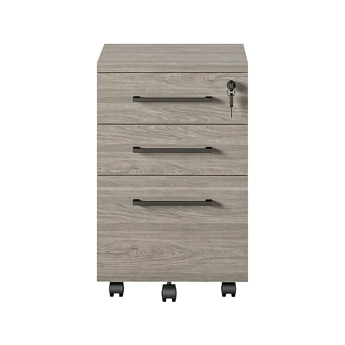 Keep your home office or commercial office organized with the Ameriwood Parkside mobile file cabinet. Two slim drawers are designed to hold loose paper, pens, notepads, and office supplies. The bottom file drawer opens easily, even when full, with its additional wheel for rolling support. This file drawer holds legal-sized hanging file folders. The ball bearing slides make accessing important documents easy and are able to withstand years of use. The top drawer features a lock that locks all three drawers to keep your items secure. The light brown woodgrain finish on durable melamine is easy to clean for accidental spills. This mobile file cabinet has been tested to meet ANSI-BIFMA standards for commercial use.