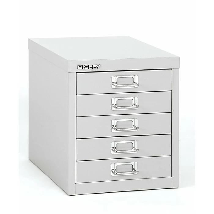 Bisley® Five drawer desktop cabinet in light gray color has built-in label holders which help to identify drawer contents with ease. Cabinet is constructed with steel and has a powder coated paint finish to provide maximum durability and style.