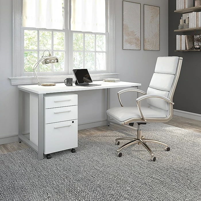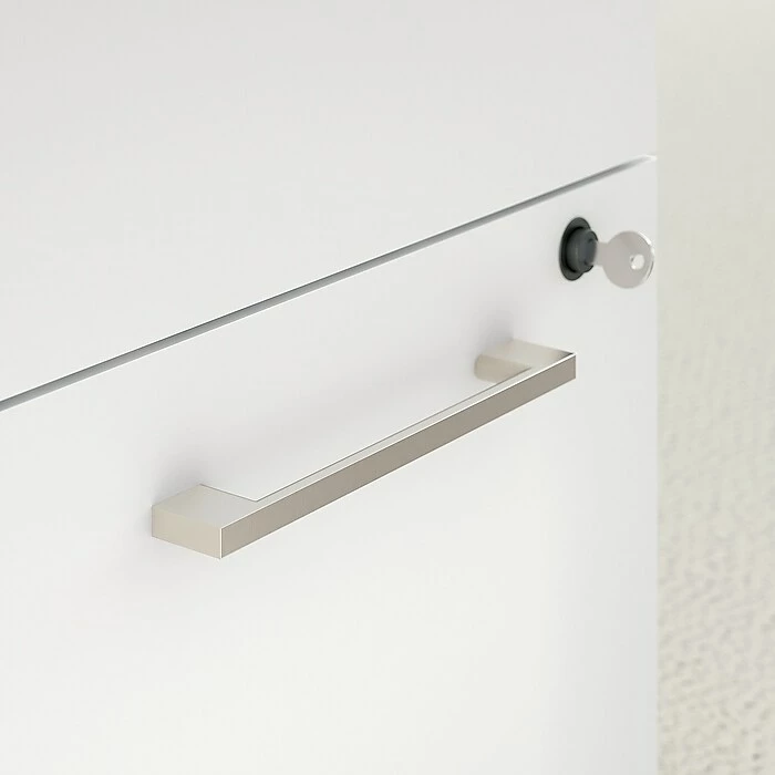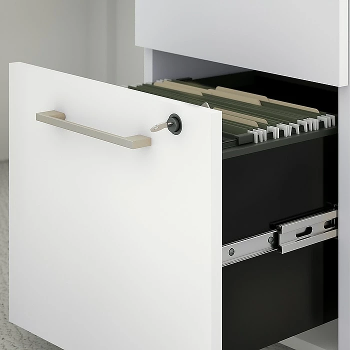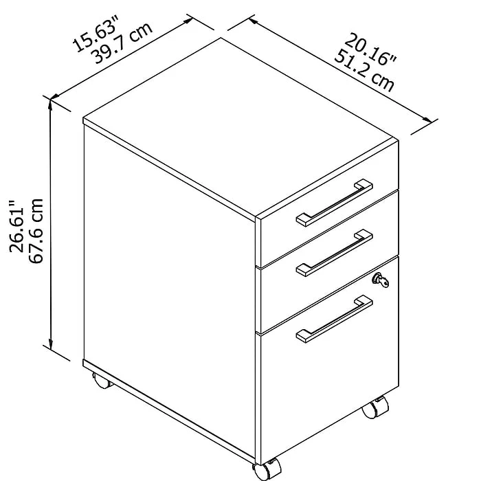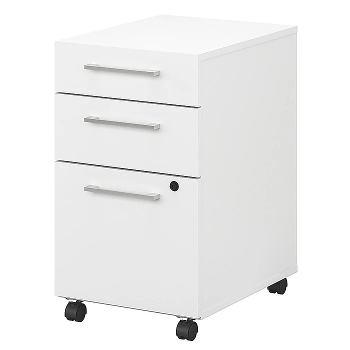 The Bush Business Furniture 400 Series 3-drawer mobile file cabinet brings a reliable, user-friendly design to your home or office for years of worry-free use. Rolling on dual-wheeled hooded casters, the convenient mobile file cabinet fosters productivity by effortlessly moving wherever you need storage. A locking file drawer secures documents at work or at home, gliding on smooth, full-extension ball bearing slides for an easy reach to letter, legal, and A4-size papers. A pair of box drawers stores office items for easy access throughout the day. Drawers boast beautiful polished nickel hardware, completing the contemporary look.