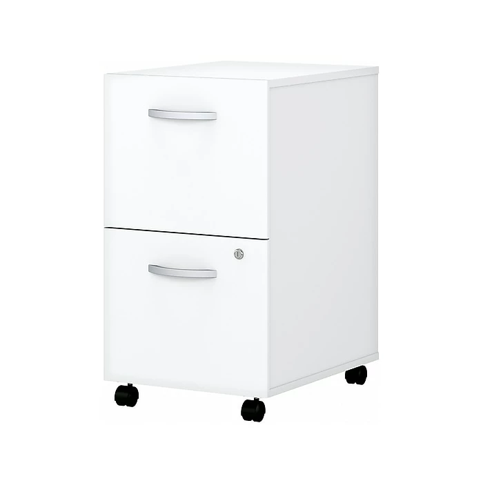 The Bush Business Furniture Easy Office two-drawer mobile file cabinet presents a perfect solution for adding storage to any professional workplace. With its dual-wheel casters and finished back, the portable file cabinet provides convenient access to legal-, letter-, and A4-size paperwork anywhere in your office. Drawers open on smooth full-extension ball bearing slides for an effortless reach to contents and can be locked to securely store documents with sensitive information. Find the perfect look for any office environment with traditional and contemporary finish options, both of which feature stylish brushed nickel drawer pulls.