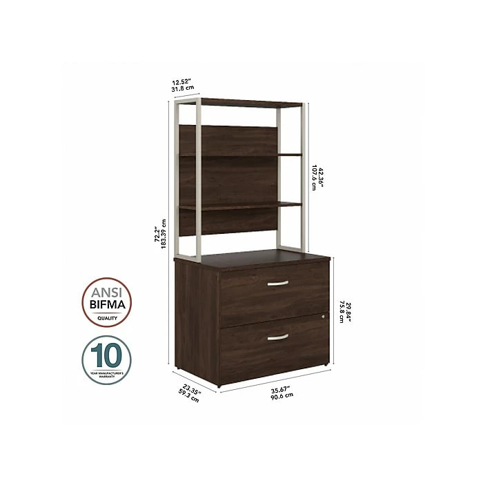 The Bush Business Furniture Hybrid two-drawer lateral file cabinet with shelves offers a stylish, long-lasting storage solution for the modern professional. Keep all your letter-, legal-, and A4-size documents organized inside the two drawers that open on full-extension ball bearing slides for an effortless reach to contents. A single lock secures both drawers to protect files with sensitive information and safeguard any personal items you don’t want left out in the open. Each drawer can hold up to 75 lbs. of materials. The open shelves are perfect for storing books or giving your office a personal touch with plants, pictures, and decorations. The bookshelf file cabinet’s stable design and included wall attachment hardware make it a safe choice for use in virtually any home or professional office environment. Find the perfect look for your space with five contemporary finish options: black walnut, modern hickory, platinum gray, storm gray, and white. This bookcase with drawers has been meticulously tested to meet or exceed ANSI/BIFMA quality standards for safety, durability, and performance and is backed by the Bush Business Furniture 10-year manufacturer warranty. See the full Bush Business Furniture Hybrid collection for coordinating items to enhance your workspace as needed, including computer desks, bookcases, and storage cabinets (coordinating items sold separately). American-made with US and imported parts.