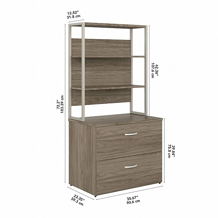 - Bundle includes: two-drawer lateral file cabinet, 36″W bookcase hutch