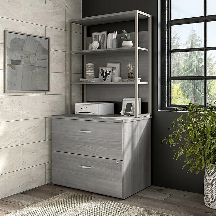 The Bush Business Furniture Hybrid two-drawer lateral file cabinet with shelves offers a stylish, long-lasting storage solution for the modern professional. Keep all your letter-, legal-, and A4-size documents organized inside two drawers that open on ball bearing slides for an effortless reach to contents. The drawers can be locked to protect files with sensitive information and safeguard personal items. The open shelves are perfect for storing books or giving your office a personal touch with plants, pictures, and decorations. The bookshelf file cabinet’s stable design and included wall attachment hardware make it a safe choice for use in virtually any home or professional office. This file cabinet with drawers has been meticulously tested to meet or exceed ANSI/BIFMA standards for safety, durability, and performance and is backed by a 10-year warranty. American-made with US and imported parts.