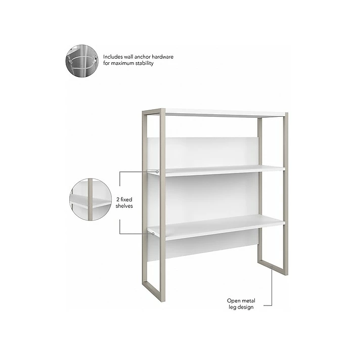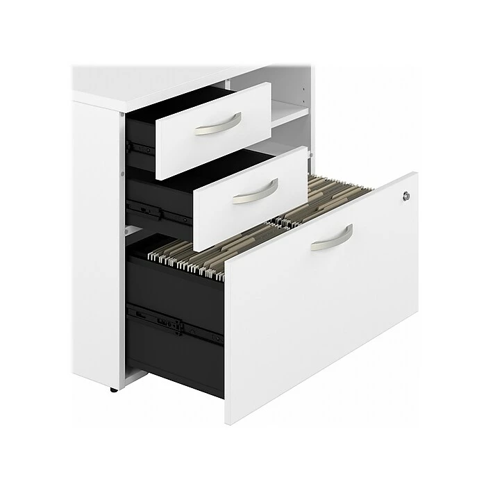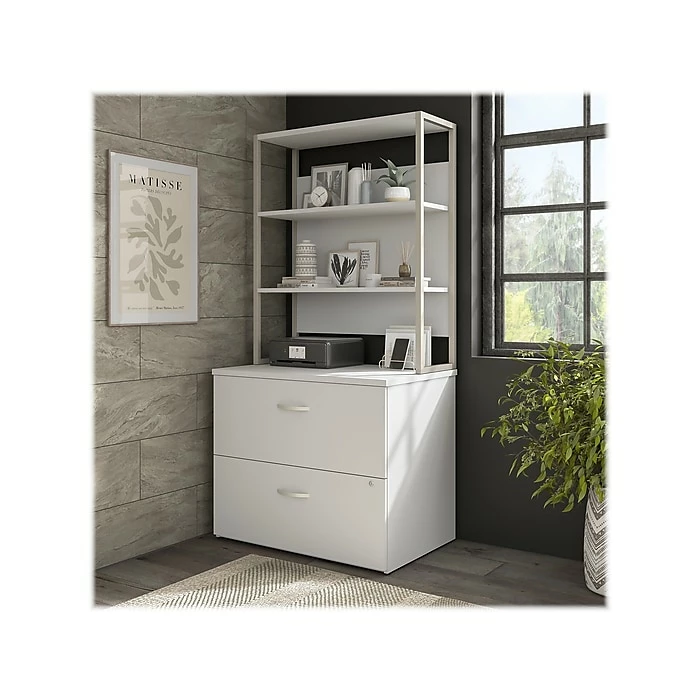 The Bush Business Furniture Hybrid two-drawer lateral file cabinet with shelves offers a stylish, long-lasting storage solution for the modern professional. Keep all your letter-, legal-, and A4-size documents organized inside the two drawers that open on full-extension ball bearing slides for an effortless reach to contents. A single lock secures both drawers to protect files with sensitive information and safeguard any personal items you don’t want left out in the open. Each drawer can hold up to 75 lbs. of materials. The open shelves are perfect for storing books or giving your office a personal touch with plants, pictures, and decorations. The bookshelf file cabinet’s stable design and included wall attachment hardware make it a safe choice for use in virtually any home or professional office environment. Find the perfect look for your space with five contemporary finish options: black walnut, modern hickory, platinum gray, storm gray, and white. This bookcase with drawers has been meticulously tested to meet or exceed ANSI/BIFMA quality standards for safety, durability, and performance and is backed by the Bush Business Furniture 10-year manufacturer warranty. See the full Bush Business Furniture Hybrid collection for coordinating items to enhance your workspace as needed, including computer desks, bookcases, and storage cabinets (coordinating items sold separately). American-made with US and imported parts.
