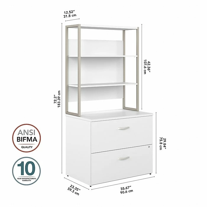 The Bush Business Furniture Hybrid two-drawer lateral file cabinet with shelves offers a stylish, long-lasting storage solution for the modern professional. Keep all your letter-, legal-, and A4-size documents organized inside two drawers that open on ball bearing slides for an effortless reach to contents. The drawers can be locked to protect files with sensitive information and safeguard personal items. The open shelves are perfect for storing books or giving your office a personal touch with plants, pictures, and decorations. The bookshelf file cabinet’s stable design and included wall attachment hardware make it a safe choice for use in virtually any home or professional office. This file cabinet with drawers has been meticulously tested to meet or exceed ANSI/BIFMA standards for safety, durability, and performance and is backed by a 10-year warranty. American-made with US and imported parts.