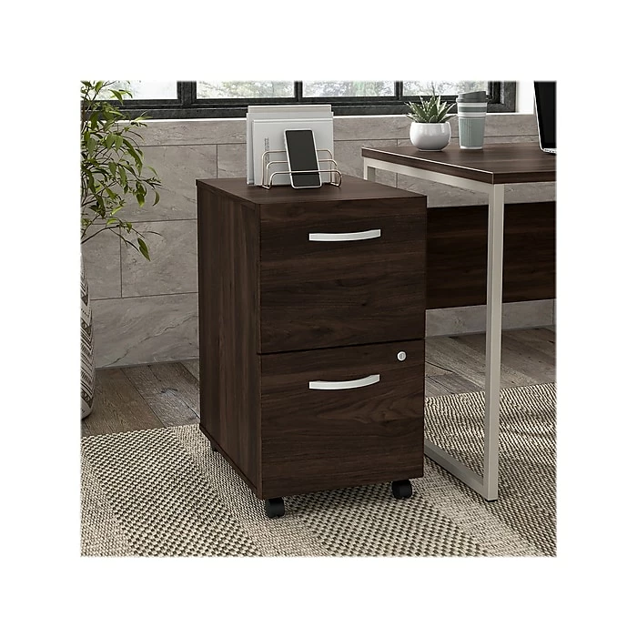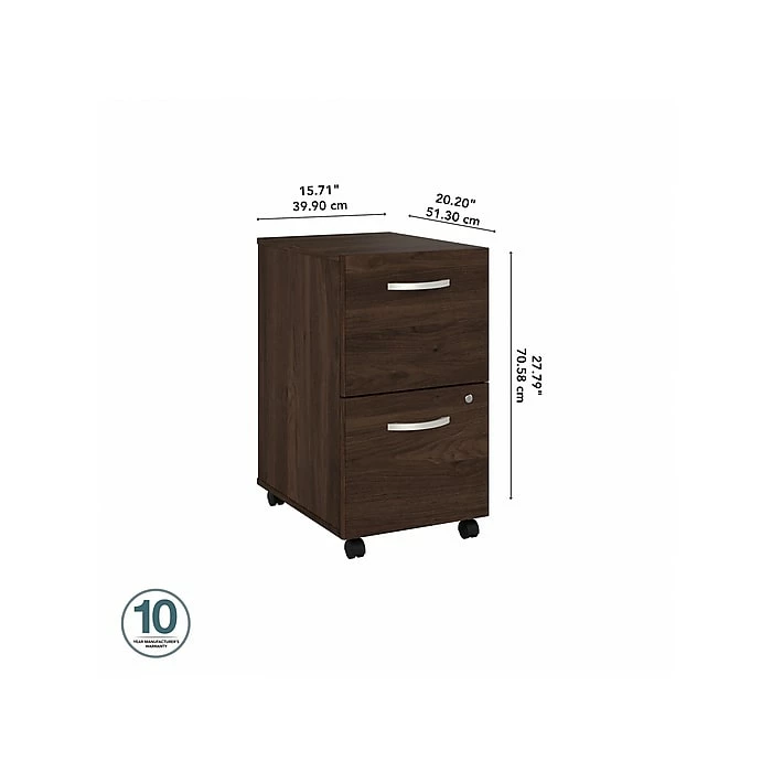 The Bush Business Furniture Hybrid two-drawer mobile file cabinet offers a stylish, long-lasting storage solution for the modern professional. Enjoy a neat and organized workspace with a file cabinet that conveniently rolls wherever you need access to important documents. Drawers open on smooth full-extension ball bearing slides for an effortless reach to letter-, legal-, and A4-size paperwork. Both drawers can be secured by a single lock to protect sensitive files or personal items. The rolling file cabinet’s compact design allows it to fit underneath a standard-size office desk for a space-saving configuration. Find the perfect look for your space with five contemporary finish options: black walnut, modern hickory, platinum gray, storm gray, and white. This two-drawer file cabinet with wheels has been meticulously tested to meet or exceed ANSI/BIFMA quality standards for safety, durability, and performance and is backed by the Bush Business Furniture 10-year manufacturer warranty. See the full Hybrid collection for coordinating items to enhance your workspace as needed, including computer desks, bookcases, and storage cabinets (coordinating items sold separately). American-made with US and imported parts.