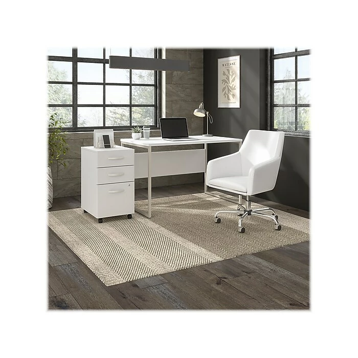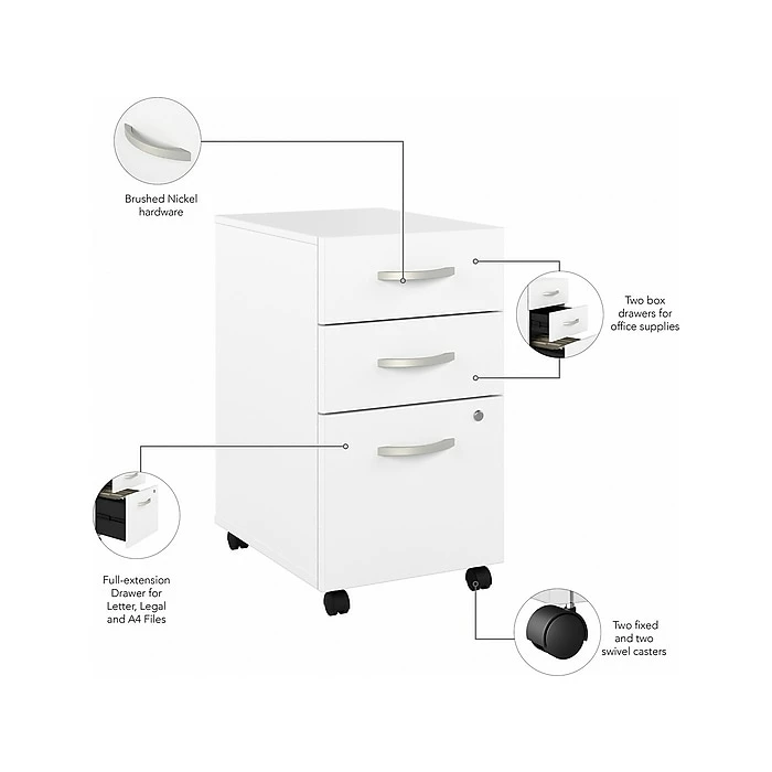 The Bush Business Furniture Hybrid three-drawer mobile file cabinet offers a stylish, long-lasting storage solution for the modern professional. Enjoy a neat and organized workspace with a file cabinet that conveniently rolls wherever you need access to important documents and supplies. The file drawer opens on smooth full-extension ball bearing slides for an effortless reach to letter-, legal-, and A4-size paperwork, while a pair of box drawers organize writing utensils, notepads, and more. The two bottom drawers can be secured by a single lock to protect sensitive files or personal items. The rolling file cabinet’s compact design allows it to fit underneath a standard-size office desk for a space-saving configuration. Find the perfect look for your space with five contemporary finish options: black walnut, modern hickory, platinum gray, storm gray, and white. This three-drawer file cabinet with wheels has been meticulously tested to meet or exceed ANSI/BIFMA quality standards for safety, durability, and performance and is backed by the Bush Business Furniture 10-year manufacturer warranty. See the full Bush Business Furniture Hybrid collection for coordinating items to enhance your workspace as needed, including computer desks, bookcases, and storage cabinets (coordinating items sold separately). American-made with US and imported parts.