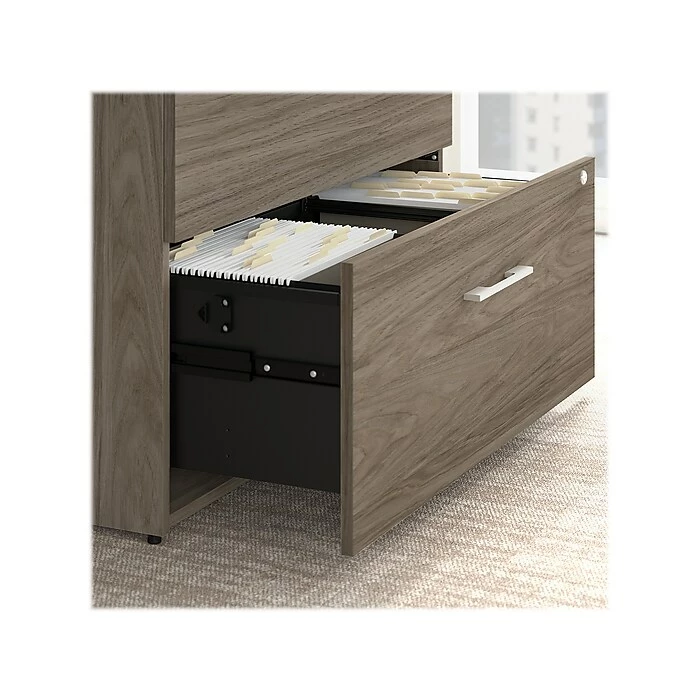 Organize paperwork and show off your favorite pictures, awards, and decorations with the Bush Business Furniture Office 500 lateral file cabinet and hutch. This file cabinet with hutch is perfect for maintaining an organized workspace while showcasing the style and personality of today’s professional. Two file drawers open on smooth full-extension ball bearing slides for an easy reach to legal-, letter-, and A4-size paperwork. A single lock secures both drawers to protect files that contain sensitive information. The bookcase hutch attaches to the top of the file cabinet, adding two open shelves that are great for storing books or displaying your favorite pictures, awards, and decorations. An elevated two-door storage cabinet conceals the reference materials and supplies you want kept in order but out of sight. This tall bookcase hutch with drawers is tested to meet ANSI/BIFMA standards for safety and performance and is backed by a 10-year warranty. American-made with US and imported parts. (the 2nd sentence is changed to avoid repetition; “bookcase hutch” instead of “bookshelf”)