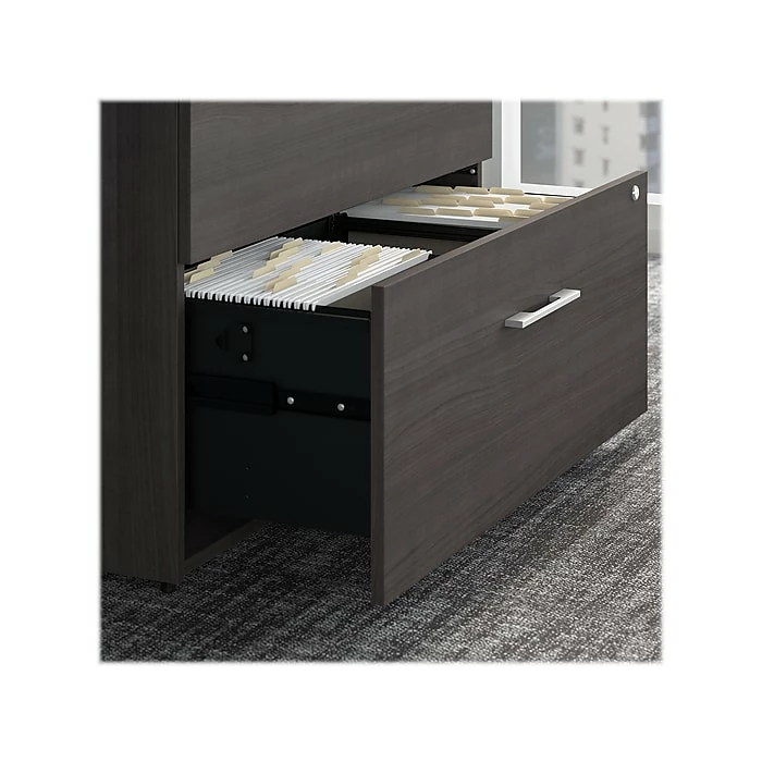 Organize paperwork and show off your favorite pictures, awards, and decorations with the Bush Business Furniture Office 500 lateral file cabinet and hutch. This file cabinet with hutch is perfect for maintaining an organized workspace while showcasing the style and personality of today’s professional. Two file drawers open on smooth full-extension ball bearing slides for an easy reach to legal-, letter-, and A4-size paperwork. A single lock secures both drawers to protect files that contain sensitive information. The bookcase hutch attaches to the top of the file cabinet, adding two open shelves that are great for storing books or displaying your favorite pictures, awards, and decorations. An elevated two-door storage cabinet conceals the reference materials and supplies you want kept in order but out of sight. This tall bookcase hutch with drawers is tested to meet ANSI/BIFMA standards for safety and performance and is backed by a 10-year warranty. American-made with US and imported parts.