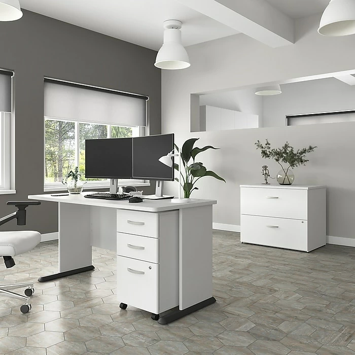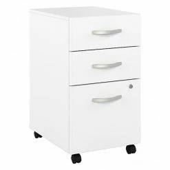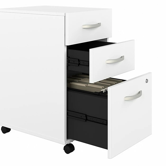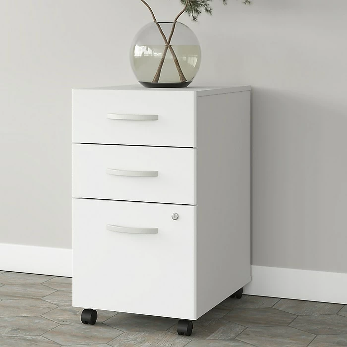 The Bush Business Furniture Studio A three-drawer mobile file cabinet combines a fresh contemporary appearance with the commercial-quality construction needed to withstand years of everyday use. The file drawer opens on smooth full-extension ball bearing slides for an effortless reach to letter-, legal-, and A4-size paperwork, while a pair of box drawers help organize writing utensils, notepads, and more. The two bottom drawers can be secured by a single lock to protect sensitive files and personal items. The rolling file cabinet’s compact design allows it to fit underneath a standard-size office desk to save space. This three-drawer file cabinet with wheels has been meticulously tested to meet or exceed the ANSI/BIFMA standards for safety, durability, and performance and is backed by a 10-year manufacturer limited warranty. American-made with US and imported parts.