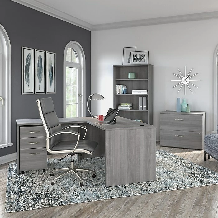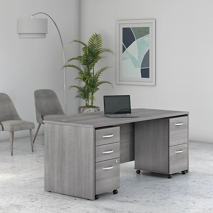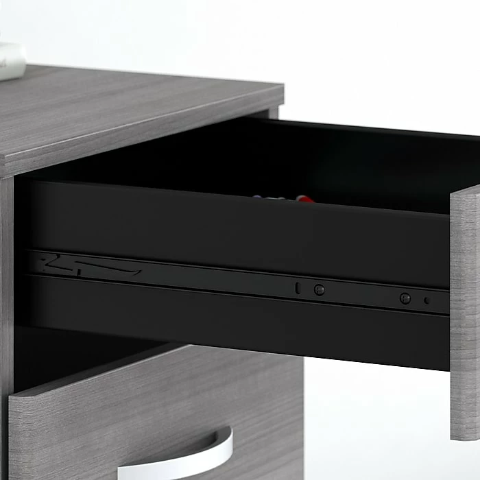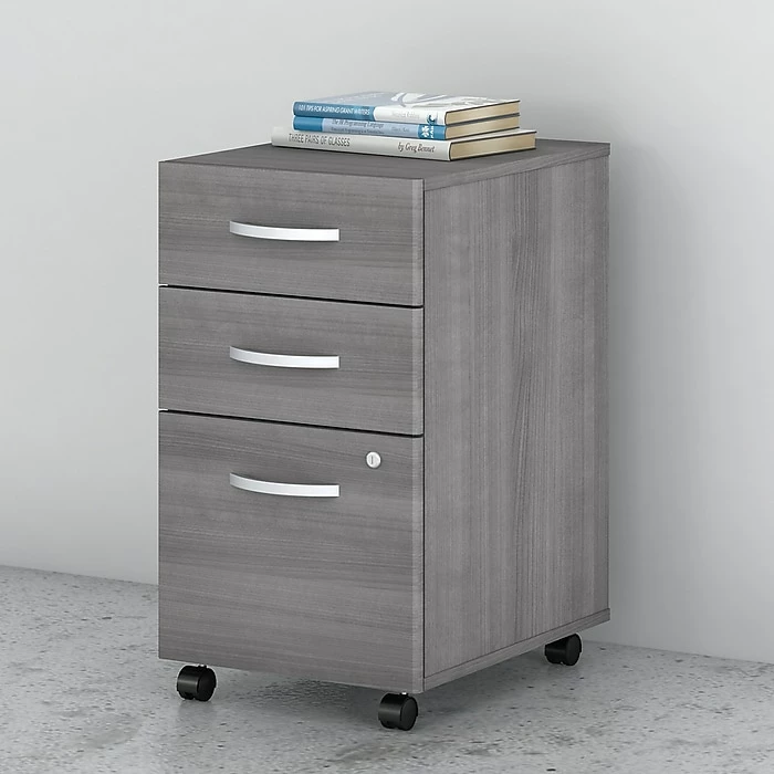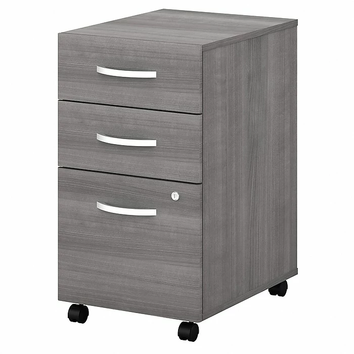 Designed to keep materials nearby, the Bush Business Furniture Studio C three-drawer mobile file cabinet features professional quality with a contemporary feel. The Bush Business Furniture Studio C three-drawer mobile file cabinet rolls with you throughout your office or remains in place as needed on any surface. You’ll have your letter-, legal- and A4-size paperwork organized in no time as the filing cabinet ships fully assembled. Two box drawers hold your pens, notepads and small office supplies. The file drawer opens on full-extension ball bearing slides, making it easy to reach papers at the back. Dual-wheel hooded casters keep the three-drawer cabinet moving on your floor or carpet. A single lock secures the bottom two drawers to protect sensitive paperwork and personal items. Eye-catching brushed nickel drawer pulls complement the finish. The mobile file cabinet comes with a 10-year warranty and meets ANSI/BIFMA quality test standards. American-made with US and imported parts.