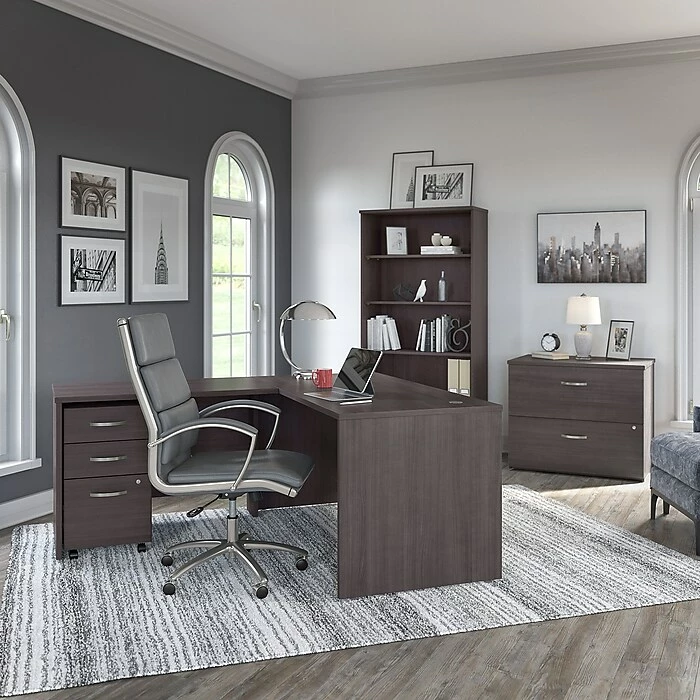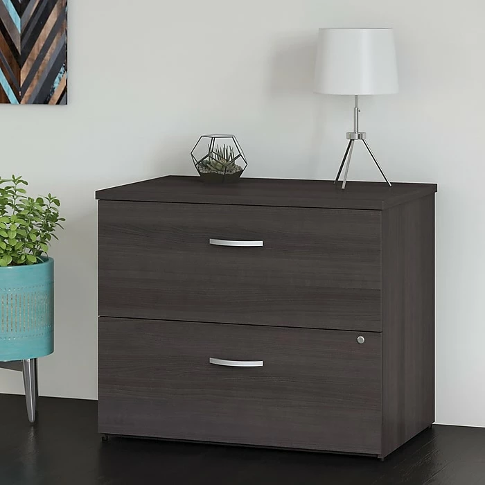 Keep your paperwork under control with the stylish and convenient Bush Business Furniture Studio C Lateral File Cabinet. Featuring 2 spacious drawers, the contemporary cabinet ships fully assembled so you’ll be organizing your letter, legal and A4-size documents in no time. The Lateral File Cabinet drawers glide on smooth, full-extension ball-bearing slides so you’ll have no trouble reaching items in the back. Store your most important files without a worry as a single lock secures both drawers. Eye-catching Brushed Nickel drawer pulls complement the White or Storm Gray finish to make the Lateral File Cabinet as attractive as it is functional. Designed with your comfort in mind, the cabinet matches the height of Studio C desks (sold separately) to extend your workspace when placed side by side. This contemporary office furniture comes with a 10 Year Warranty and meets ANSI/BIFMA quality test standards. See the full collection for coordinating items available to make your office your own with Studio C. American made with U.S. and imported parts.