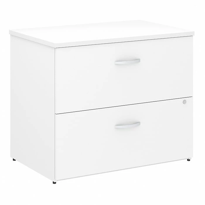 Keep your paperwork under control with the stylish and convenient Bush Business Furniture Studio C Lateral File Cabinet. Featuring 2 spacious drawers, the contemporary cabinet ships fully assembled so you’ll be organizing your letter, legal and A4-size documents in no time. The Lateral File Cabinet drawers glide on smooth, full-extension ball-bearing slides so you’ll have no trouble reaching items in the back. Store your most important files without a worry as a single lock secures both drawers. Eye-catching Brushed Nickel drawer pulls complement the White or Storm Gray finish to make the Lateral File Cabinet as attractive as it is functional. Designed with your comfort in mind, the cabinet matches the height of Studio C desks (sold separately) to extend your workspace when placed side by side. This contemporary office furniture comes with a 10 Year Warranty and meets ANSI/BIFMA quality test standards. See the full collection for coordinating items available to make your office your own with Studio C. American made with U.S. and imported parts.