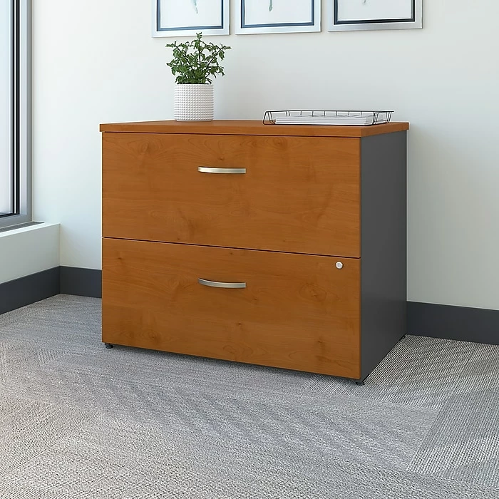 Expand your office with the Bush Business Furniture Westfield 36W Lateral File Cabinet. Combine with a matching Westfield Desk to extend your work surface or use the Cabinet on its own. File your letter, legal and A4 documents in 2 generous drawers gliding on smooth full-extension ball bearing slides for an effortless reach to the back. Adjustable levelers compensate for uneven flooring, while an interlocking drawer mechanism prevents against tipping. Brushed Nickel hardware and clean lines make an impressive statement, as the sturdy design fends off damage for years of professional quality. Westfield offers endless layout options, expansion opportunities and 7 finishes. This affordable office furniture withstands the rigors of a 40-plus hour work week and comes with a 10 Year Warranty. American made with U.S. and imported parts.