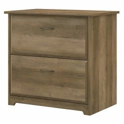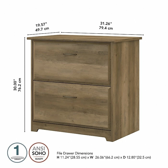 The Bush Furniture Cabot two-drawer lateral file cabinet is a great way to keep important documents organized and accessible in your home office. Featuring a timeless traditional style, this file cabinet includes two spacious drawers that accept legal-, letter-, and A4-size paperwork. Both drawers open on smooth, full-extension ball-bearing slides for an easy reach to contents all the way at the back. The two-drawer file cabinet can also be used with the coordinating Cabot corner desk or L-shaped desk (sold separately) to create an extended work surface when placed side by side. Each drawer is fitted with stylish handles that complement your choice of several attractive finishes to complete the simple, elegant appearance. This two-drawer lateral filing cabinet is tested to meet ANSI/SOHO standards for safety and performance and is backed by the Bush Furniture 1-year manufacturer limited warranty.