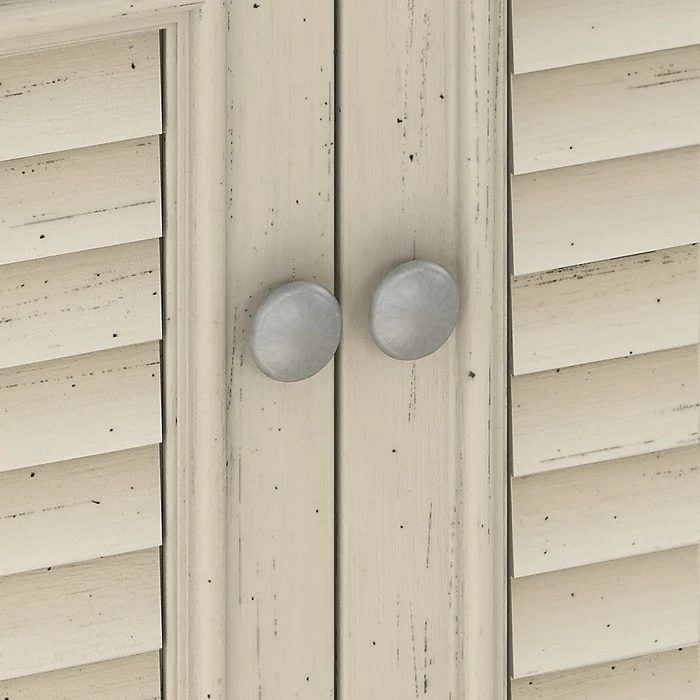 Keep your space in order while invoking the cozy, welcoming charm of modern farmhouse styling with the Bush Furniture Fairview Storage Cabinet with Drawer. A slightly weathered finish pairs nicely with Antique Pewter hardware to create a casual look, while durable construction and practical features ensure its long lasting appeal. This multifunctional Storage Cabinet has 2 louvered doors opening on Euro style hinges that conceal 3 shelves, 2 of which can be adjusted to store a variety of items. A full extension lateral file drawer glides on smooth ball bearing slides and holds legal and letter sized documents. The top of the cabinet offers enough surface area at a natural height to display your favorite trinkets and mementos. This file cabinet has been tested to meet ANSI/SOHO standards for safety and performance and is backed by the Bush Furniture 6 Year Manufacturer’s Warranty.