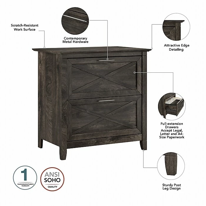 A natural fit for homes that embrace coastal and farmhouse decor, the Bush Furniture Key West two-drawer lateral file cabinet is perfect for organizing paperwork in virtually any room. Two file drawers open on smooth full-extension ball bearing slides for an easy reach to legal- and letter-size documents. A stylish X-pattern accent on the drawer panels creates a relaxed style supported by a sturdy and attractive post-leg design. This lateral file cabinet matches the height of any Bush Furniture Key West desk (sold separately) to create an extended work surface when placed side by side. The Bush Furniture Key West collection offers a wide variety of farmhouse furniture that makes building a complete home office or living room a breeze. This two-drawer file cabinet is tested to meet ANSI/SOHO quality standards for safety and performance and is backed by the Bush Furniture 1-year manufacturer limited warranty.