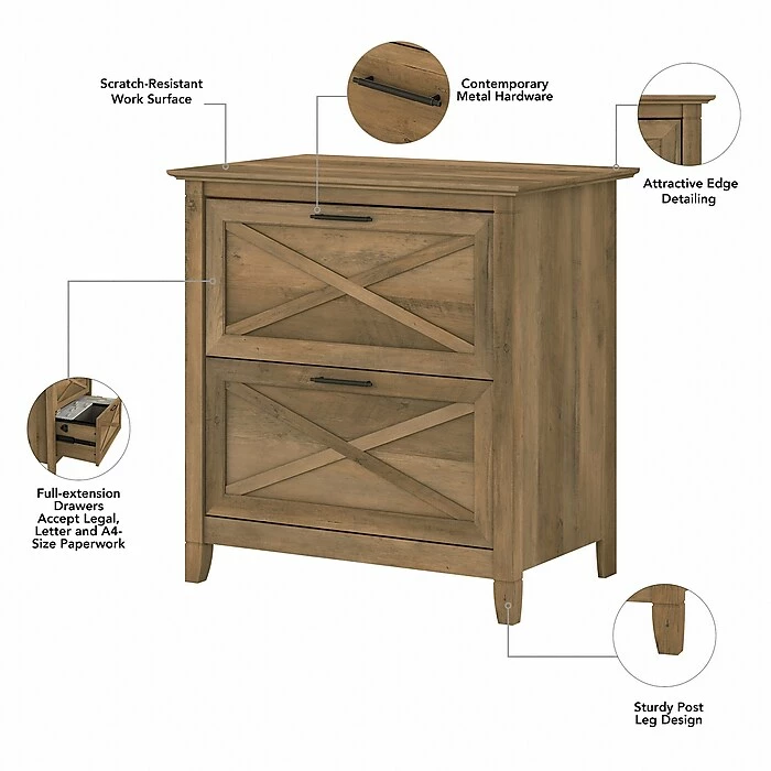 A natural fit for homes that embrace coastal and farmhouse decor, the Bush Furniture Key West two-drawer lateral file cabinet is perfect for organizing paperwork in virtually any room. Two file drawers open on smooth, full-extension ball bearing slides for an easy reach to legal- and letter-size documents. A unique X-pattern accent on the drawer panels creates a relaxed style supported by a sturdy and attractive post-leg design. This lateral file cabinet matches the height of any Bush Furniture Key West desk (sold separately) to create an extended work surface when placed side by side. The Bush Furniture Key West collection offers a wide variety of farmhouse furniture that makes building a complete home office or living room a breeze. This two-drawer file cabinet is tested to meet ANSI/SOHO quality standards for safety and performance and is backed by the Bush Furniture 1-year manufacturer limited warranty.