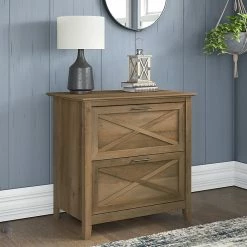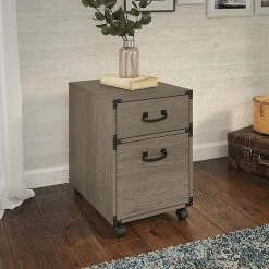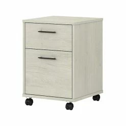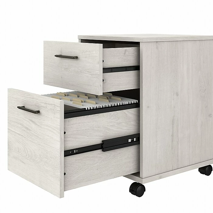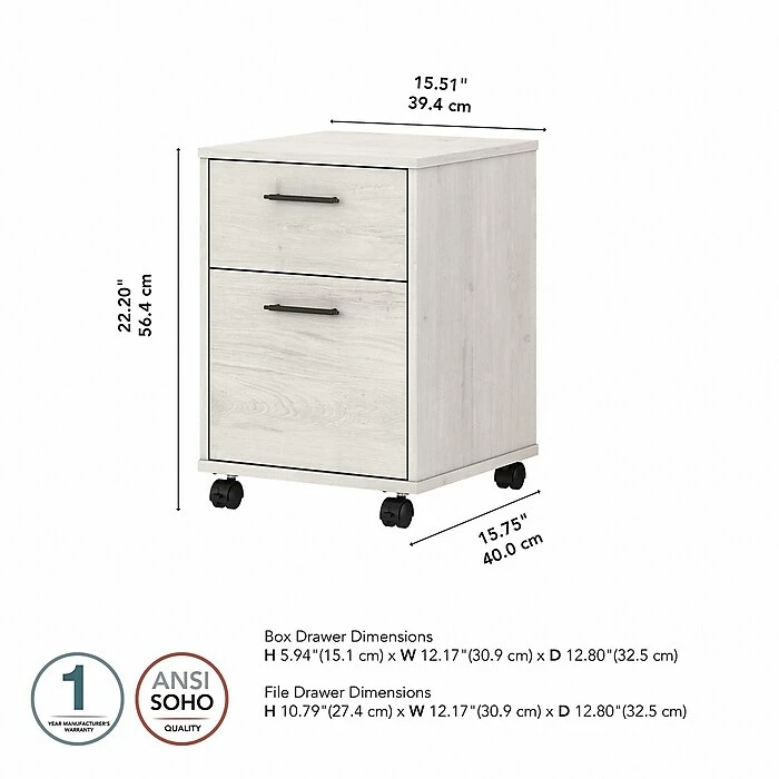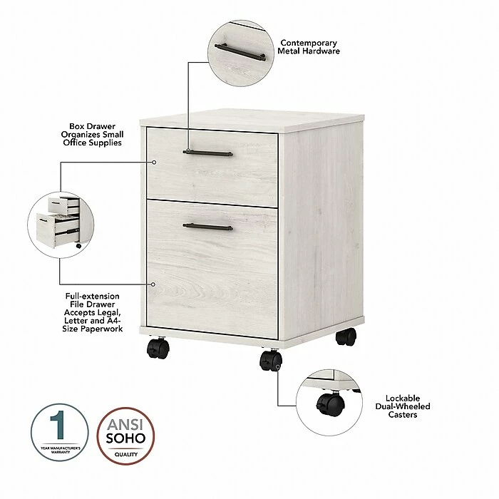 The Bush Furniture Key West two-drawer mobile file cabinet combines modern functionality and space efficiency to offer an excellent storage solution for your home office. A convenient box drawer organizes writing utensils, notepads, and more so the supplies you need are never out of reach. The file drawer opens on smooth full-extension ball bearing slides for easy access to letter-size paperwork. This rolling file cabinet features locking front casters for secure placement and is finished on all sides to look great facing any direction. The file cabinet fits conveniently under coordinating Key West desks (sold separately) to create an all-in-one personal workspace. This two-drawer file cabinet is tested to meet ANSI/SOHO quality standards for safety and performance and is backed by a 1-year manufacturer limited warranty. See the full collection for coordinating items available.