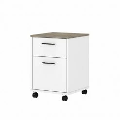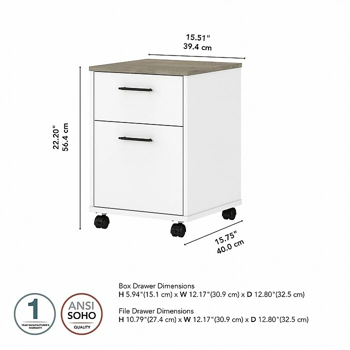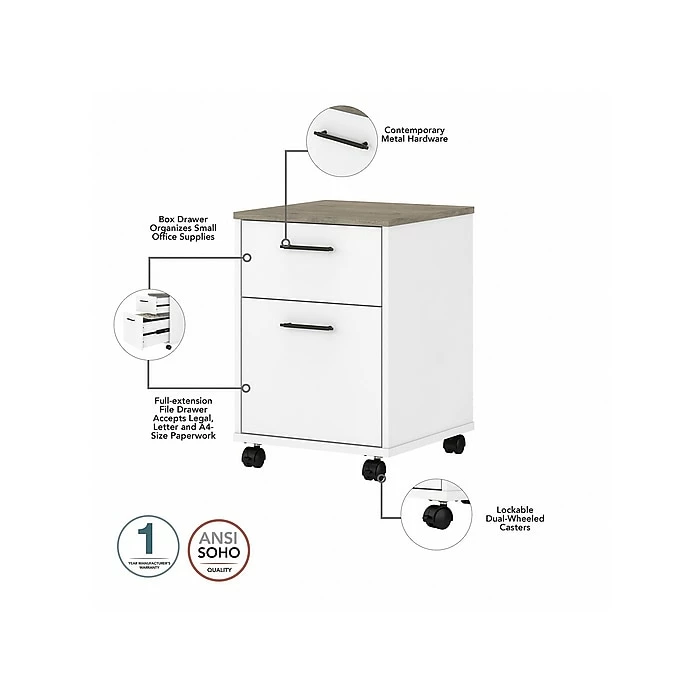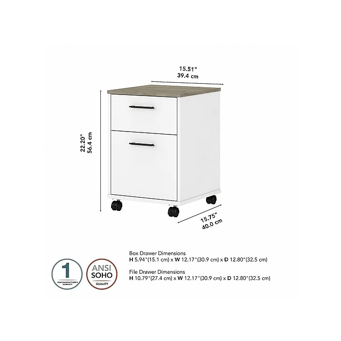 The Bush Furniture Key West two-drawer mobile file cabinet combines modern functionality and space efficiency to offer an excellent storage solution for your home office. A convenient box drawer organizes writing utensils, notepads, and more so the supplies you need are never out of reach. The file drawer opens on smooth, full-extension ball bearing slides for easy access to letter-size paperwork. This rolling file cabinet features locking front casters for secure placement and is finished on all sides to look great facing any direction. The two-drawer file cabinet fits conveniently under coordinating Key West desks (sold separately) to create an all-in-one personal workspace. This two-drawer file cabinet is tested to meet ANSI/SOHO quality standards for safety and performance and is backed by a 1-year manufacturer limited warranty. See the full collection for coordinating items available.