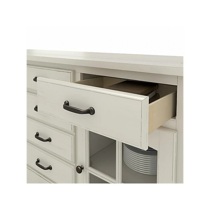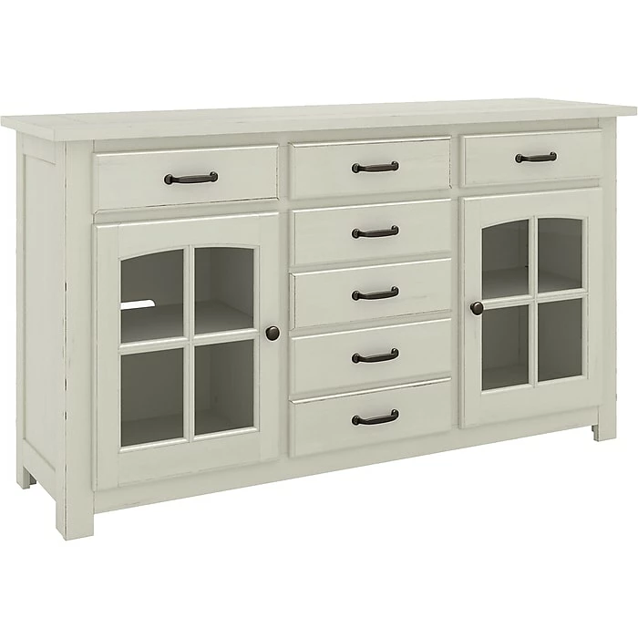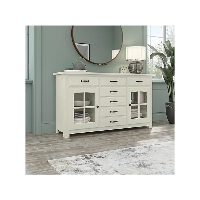 The Bush Furniture Leonis 62″W buffet cabinet presents a practical dinner and drinkware storage solution with style to suit your casual home. A durable post leg design and decorative wood detailing create a relaxed appearance that perfectly complements farmhouse, rustic, and vintage furniture. Two storage cabinets with glass doors and one disguised as drawers make it easy to organize plates and cups of various sizes. Take advantage of three drawers to stash eating utensils, bar accessories, napkins, coasters, and more. The credenza’s surface offers plenty of room to brighten up your space with plants, pictures, and decorations. Skip the hassle of assembly with a sideboard cabinet that’s ready to use right out of the box. This buffet cabinet has been rigorously tested to meet Bush Furniture’s standards for safety, durability, and performance and is backed by a 1-year manufacturer warranty.