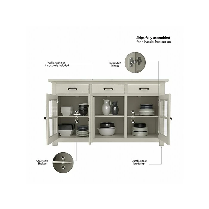 - Sideboard includes three storage cabinets with one adjustable shelf each for plates, cups, and other dinnerware