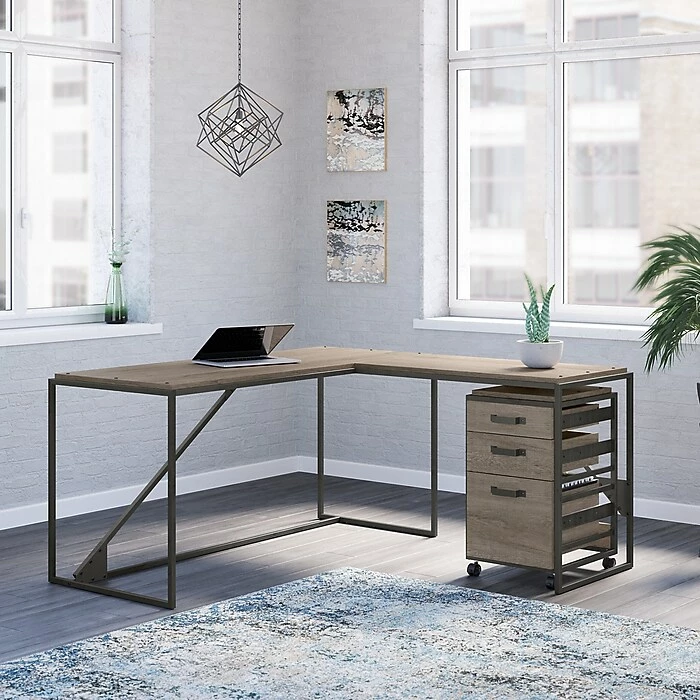 Organize your home, and express your rustic taste with the Bush Furniture Refinery three-drawer mobile file cabinet. Featuring an open industrial steel frame along with matching hardware and exposed bolts, the file cabinet combines a reclaimed feel with complete convenience. Perfect for the home office, loft, or creative space, the portable file cabinet rolls anywhere on dual-wheel casters that can be locked into place once you’ve found the perfect position. A full-extension file drawer opens on smooth ball bearing slides for easy access to contents all the way in the back. Store pens, papers, and other small office supplies in a pair of box drawers. This rolling file cabinet has been tested to meet ANSI/SOHO standards for safety and performance and is backed by a 1-year manufacturer limited warranty. View the full line of industrial furniture to find the perfect fit for your work or living space.