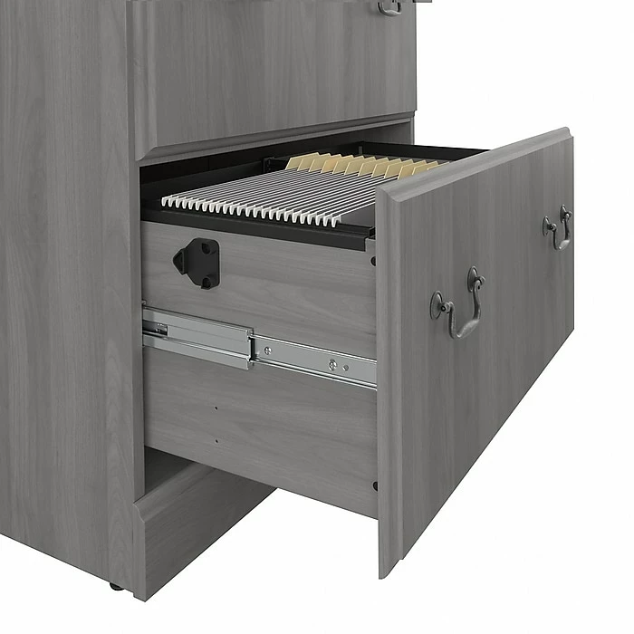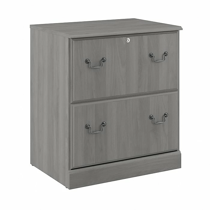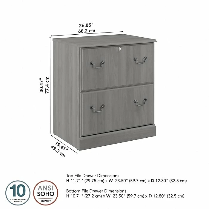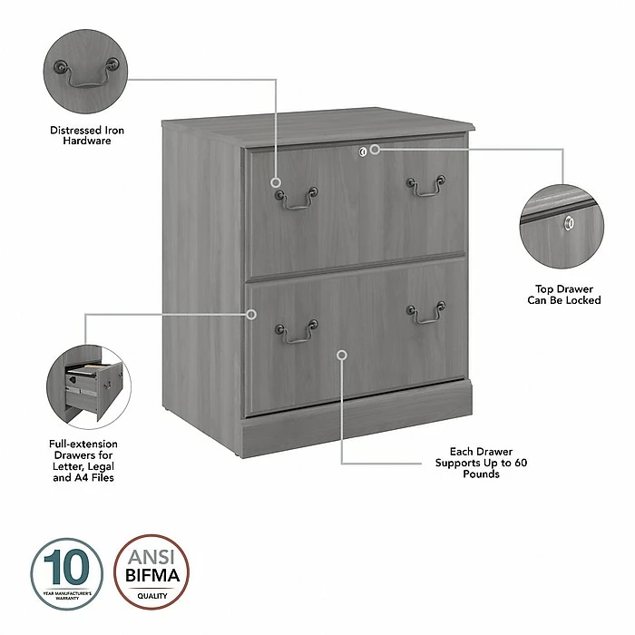 Enjoy the refined elegance of timeless traditional styling while keeping paperwork in order with the Bush Furniture Saratoga two-drawer lateral file cabinet. A perfect choice for virtually any office or private study, the file cabinet features two spacious file drawers that accept letter-, legal-, and A4-size documents. Drawers open on smooth full-extension ball bearing slides for an effortless reach to contents and are designed to extend one at a time for maximum stability. Each drawer holds up to 60 lbs. of materials, and the upper drawer can be locked to protect your personal information and other sensitive paperwork. The two-drawer file cabinet’s classic appearance is enhanced by decorative edge details and old-fashioned drop handle drawer pulls. This locking file cabinet has been tested to meet ANSI/BIFMA quality standards for safety and performance and is backed by a 10 Year Manufacturer’s Warranty.