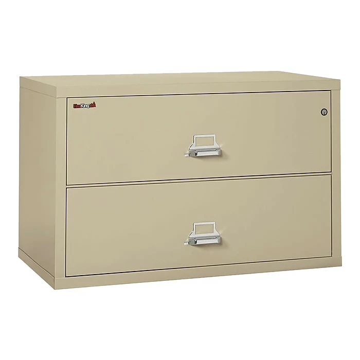Protect hard drives, medical records and financial documents in this 2-drawer filing cabinet. Each drawer is water resistant and rated for up to one hour of fire resistance, so your documents and important media stay safe. This 44.5-inch FireKing lateral file cabinet includes a high-security key lock, keeping your mind at ease knowing that your files are safe.