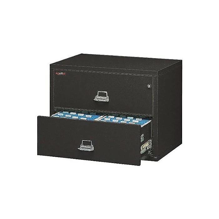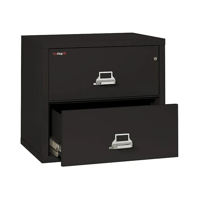 Use this heavily insulated file cabinet to organize letter-sized and legal-sized folders. The inter-drawer insulation of this cabinet keeps files safe in the event of a fire, and the high-security key lock ensures that documents are for your eyes only. This lateral file cabinet comes equipped with water-resistant technology, which prevents water from damaging files. With two roomy drawers, this FireKing file cabinet offers enough space to store essential papers for optimum organization.