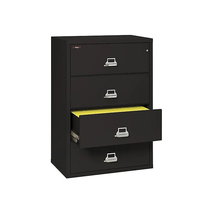 Use this heavily insulated file cabinet to organize letter- and legal-sized folders. The inter-drawer insulation of this cabinet keeps files safe in the event of a fire, and the high-security key lock ensures that documents are for your eyes only. This lateral file cabinet comes equipped with water-resistant technology, which prevents water from damaging files. With four roomy drawers, this FireKing file cabinet offers enough space to store essential papers for optimum organization.
