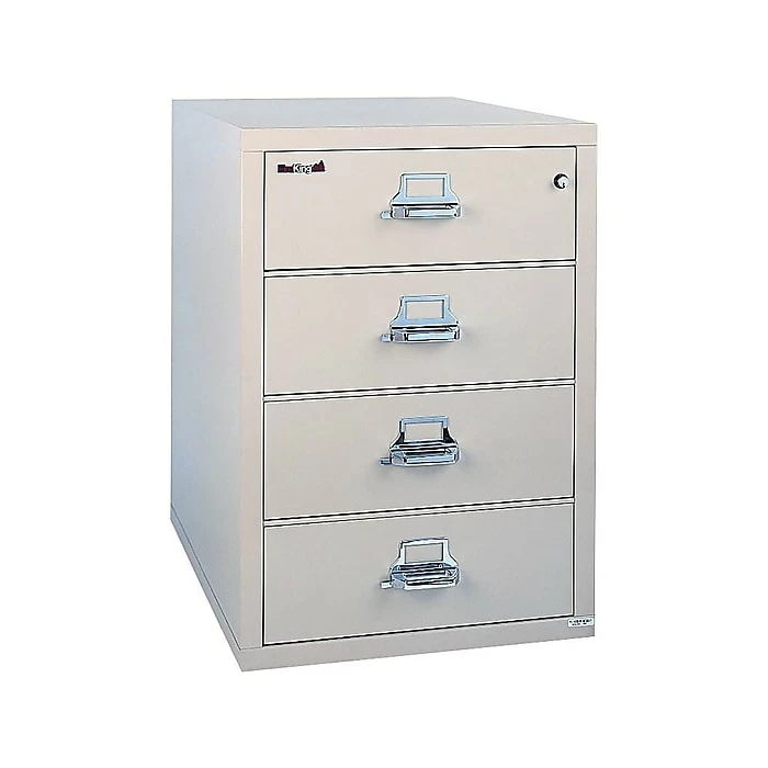 Use this heavily insulated file cabinet to organize letter-sized and legal-sized folders. The inter-drawer insulation of this cabinet keeps files safe in the event of a fire, and the high-security key lock ensures that documents are for your eyes only. This lateral file cabinet comes equipped with water-resistant technology, which prevents water from damaging files. With four roomy drawers, this FireKing file cabinet offers enough space to store essential papers for optimum organization.