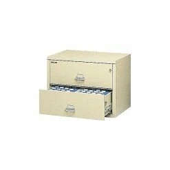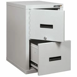 - Two-drawer vertical filing cabinet holds legal-size documents