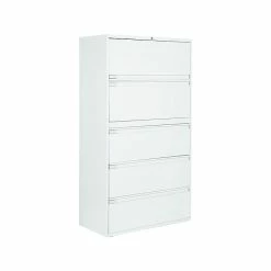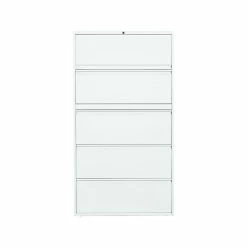 - Five-drawer lateral filing cabinet holds letter or legal-size documents