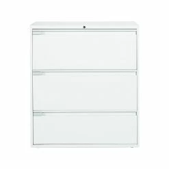 - Three-drawer lateral filing cabinet holds letter or legal-size documents