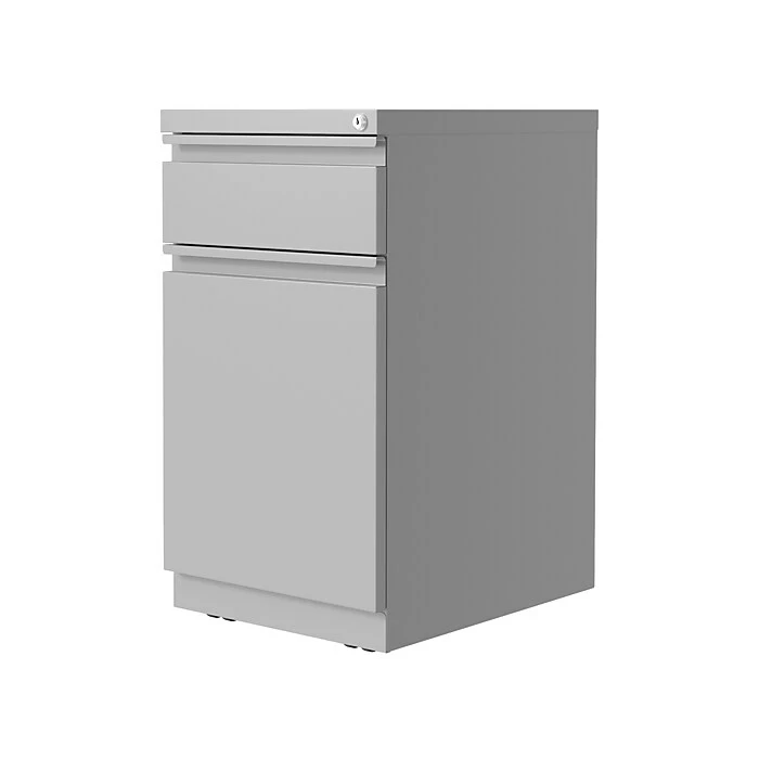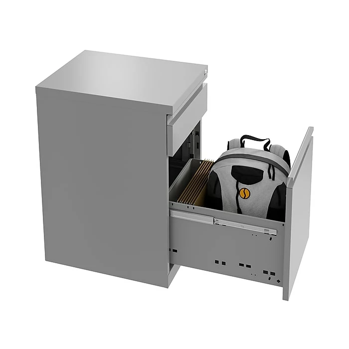 This Hirsh 19.88″ deep mobile pedestal file cabinet with a two-drawer configuration is designed to support the demand of today’s office. The backpack drawer is perfect for laptop bags and attachés. Durable, fully assembled steel construction with a nonporous surface is easy to clean and disinfect. This commercial-grade mobile pedestal comes standard with factory-installed hidden casters, full-extension drawers, counterweights, and a core-removable lock for security. The backpack drawer can also accommodate letter-size hanging files. The ball bearing suspension ensures a smooth and quiet drawer performance. Its extended front with full-width drawer pulls provides a sleek and contemporary design.