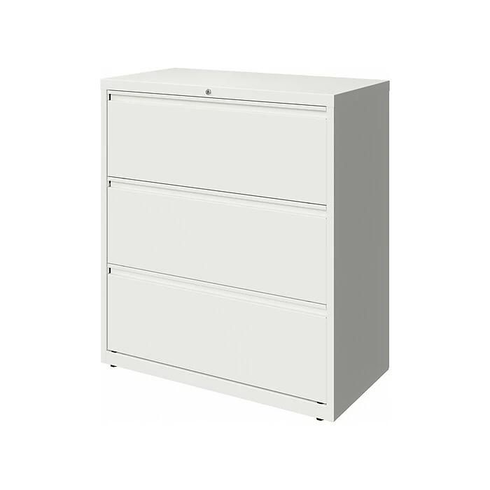 - Three-drawer lateral file cabinet holds letter-, legal- or A4 size documents