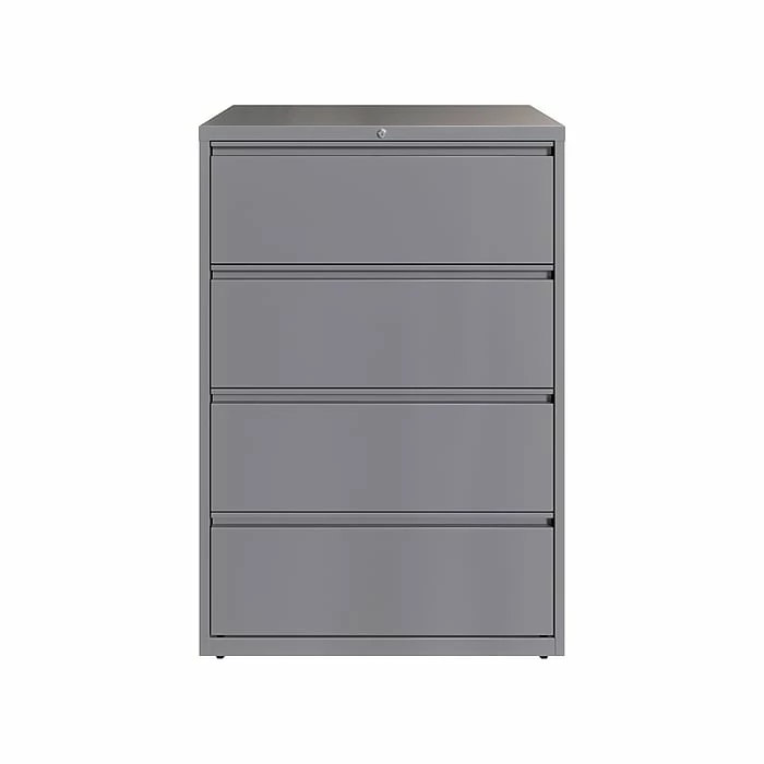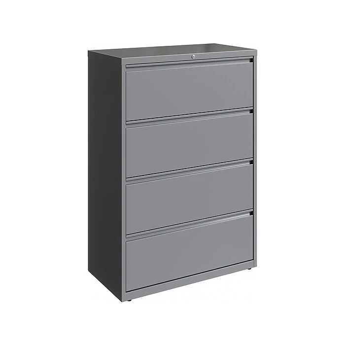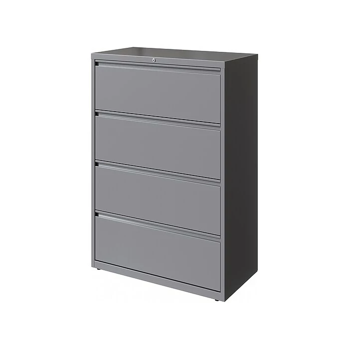 - Four-drawer lateral file cabinet holds letter-, legal-, or A4 size documents