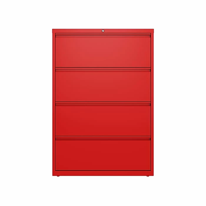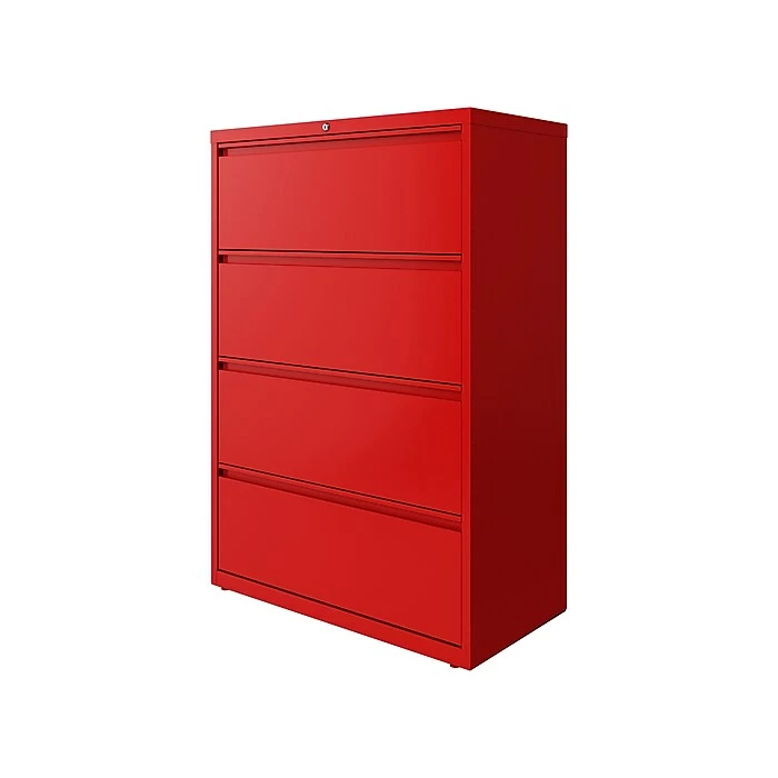 - Four-drawer lateral file cabinet holds letter-, legal-, or A4-size documents