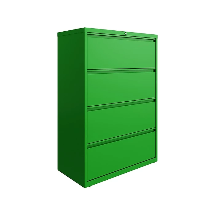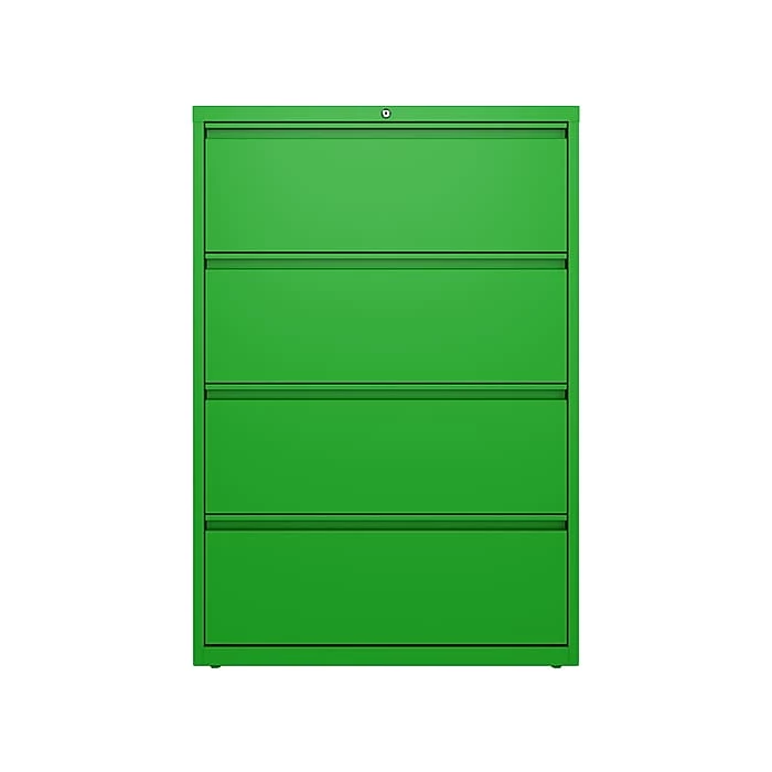 - Four-drawer lateral file cabinet holds letter-, legal-, or A4-size documents