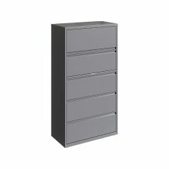 - Five-drawer lateral file cabinet holds letter-, legal-, or A4-size documents
