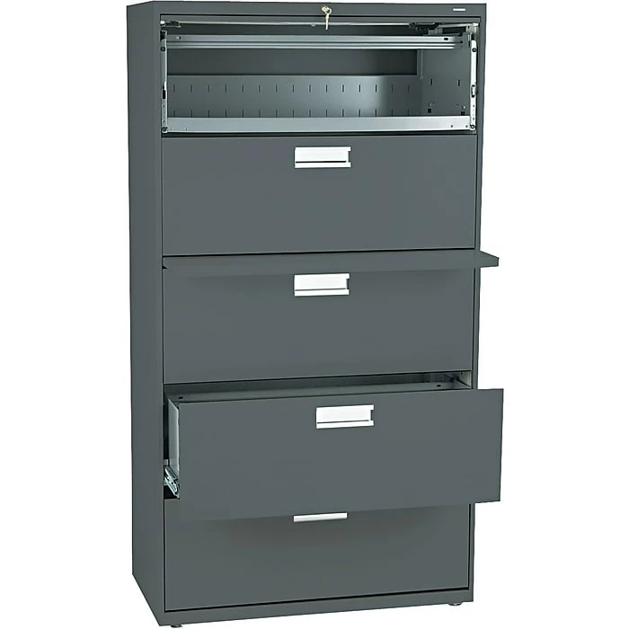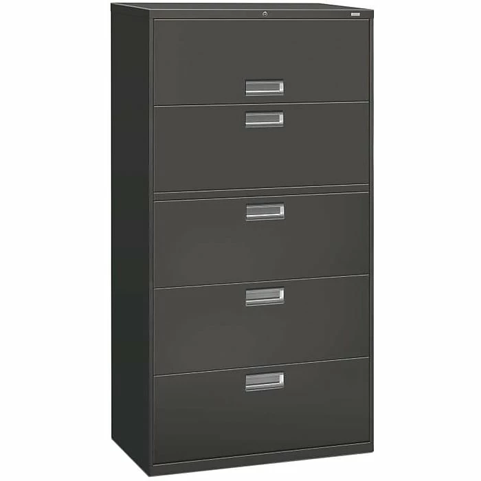 HON® Brigade™ 600 Series Lateral file cabinet in charcoal color with reinforced construction offers maximum rigidity. Lateral file is 36″ wide and its five drawers with adjustable handrails enables side-to-side filing.