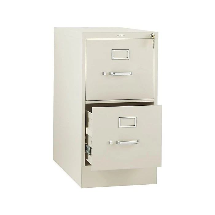 - Two-drawer vertical filing cabinet holds letter-size documents
