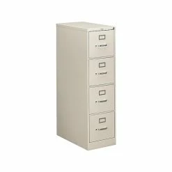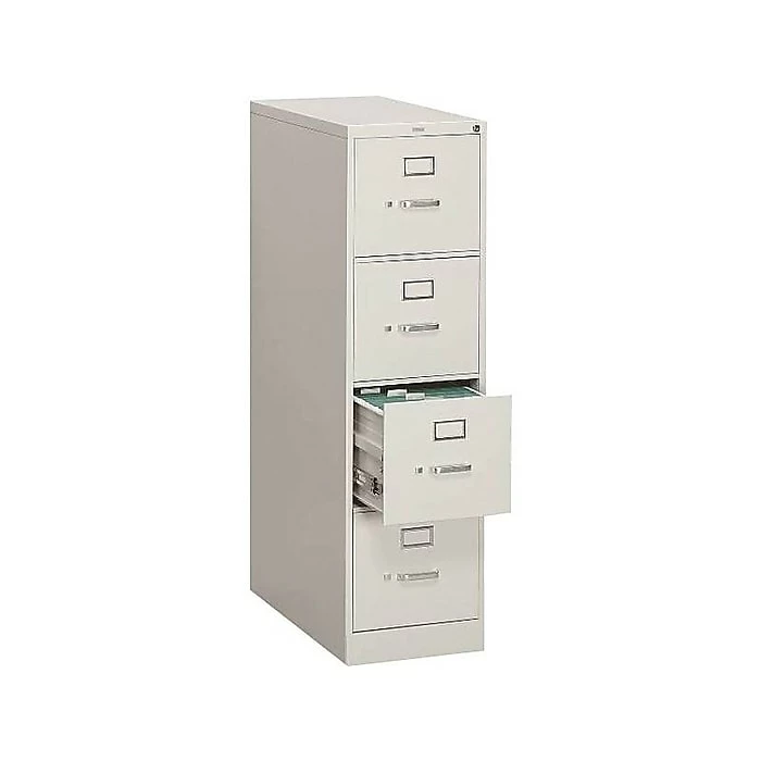 - Four-drawer vertical filing cabinet holds letter-size documents