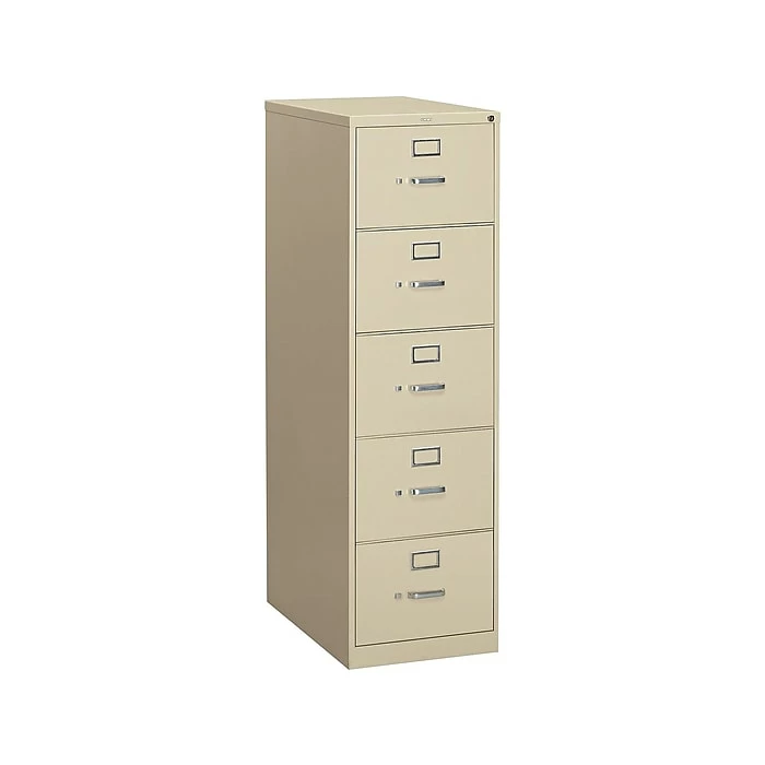 Provide secure, organized storage for important contracts and documents with this five-drawer file cabinet. Removable, interchangeable One Key core locks limit access to authorized personnel, and the high drawer sides easily fit hanging folders without the need for extra handrails. With an all-welded steel frame construction and four vertical reinforcements, this HON file cabinet holds up to rigorous daily use.