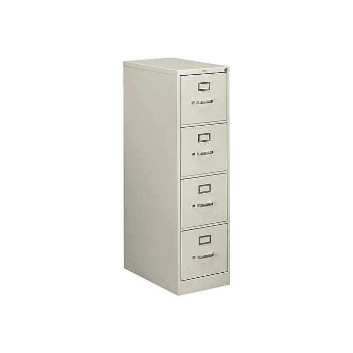 - Four-drawer vertical filing cabinet holds letter-size documents